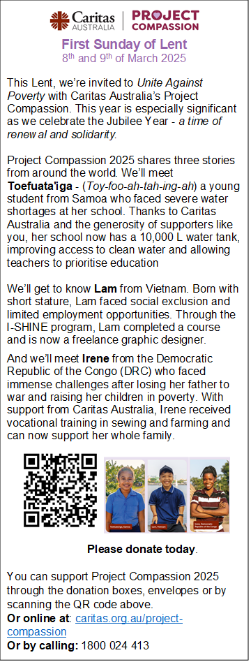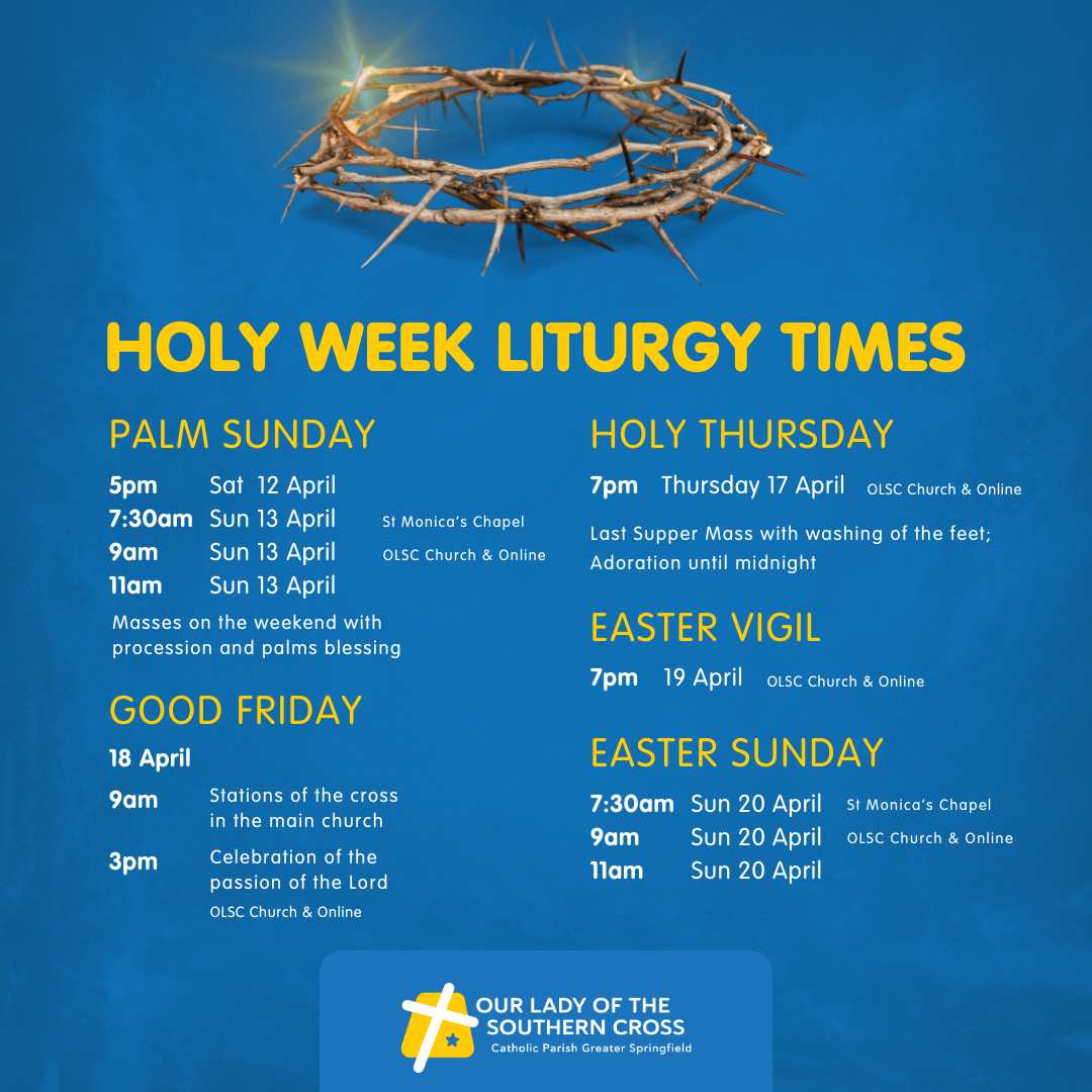 Greetings OLSC parishioners. This weekend (due to Cyclone Alfred), we have decided on one pre-recorded mass you can watch on Facebook at your leisure. We will schedule it at 9am as per our normal schedule.